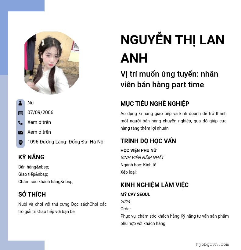 Vị trí muốn ứng tuyển: nhân viên bán hàng part time