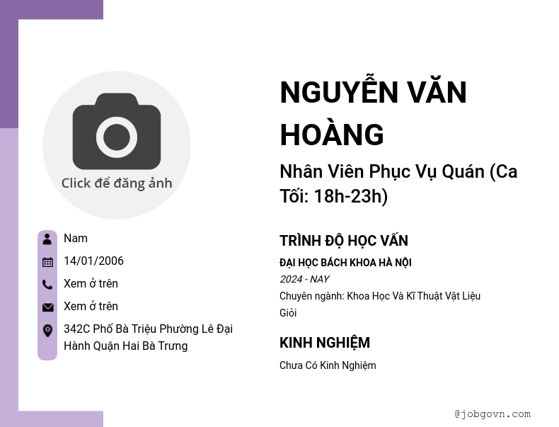 Nhân Viên Phục Vụ Quán (Ca Tối: 18h-23h)